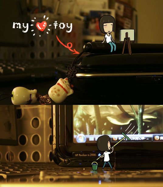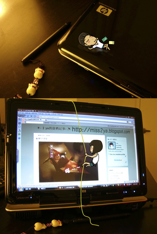 今天我要秀一下我和我的新欢的合影! --就是刚入手的HP TX2000 tablet PC. 写画时几乎可以替代wacom 板的流畅感.漂亮的机身,一大堆酷酷的功能,像指纹登录,兰牙无线.等等.结合VISTA 手写笔记.感觉非常方便.赞!赞!
