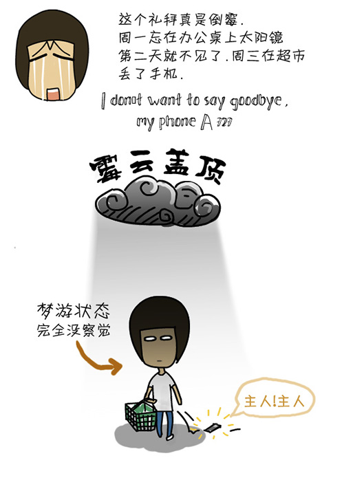 我怎么了?提前进入老龄化了吗?还是这个礼拜注定我交霉运?周一掉了太阳镜,昨晚在超市掉了手机,今早手里提着午餐包出门以后发现诡异的不见了。太阳镜我放在办公桌上下班,第二天来就不见了。昨晚上完健身课,饿的两腿发软,头脑一片空白。明明拿着钱包手机进超市,买完吃的结帐出来完全不记得手机了,还好钱包有拿(废话,要付钱啊)今天去超市失物处找也没有。可恶!我打自己的号码无数次,居然被马上断掉。估计是我的SIM卡被换了。我的手机是不大可能找回来了。我心爱的samsung A727,,我的小黑~~