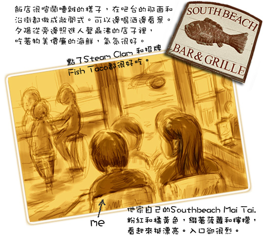 周日下午被朋友叫出来吃饭。饭店在Ocean Beach的South beach bar&grille 以美味的Fish Taco闻名。店子很旧,吧台顶上挂满了各种各样的啤酒桶把手。食物当然没话说,价钱也很平。人真的非常多,大多是站在吧台喝酒聊天,也有很多人站着等位子。嘈杂程度有几分国内的火锅店的架势。我觉得这样吃起来很香,也很自由。